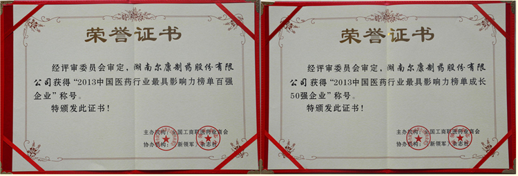 尔康制药荣获2013年度中国医药行业最具影响力榜单“百强企业”、“成长50强”殊荣
