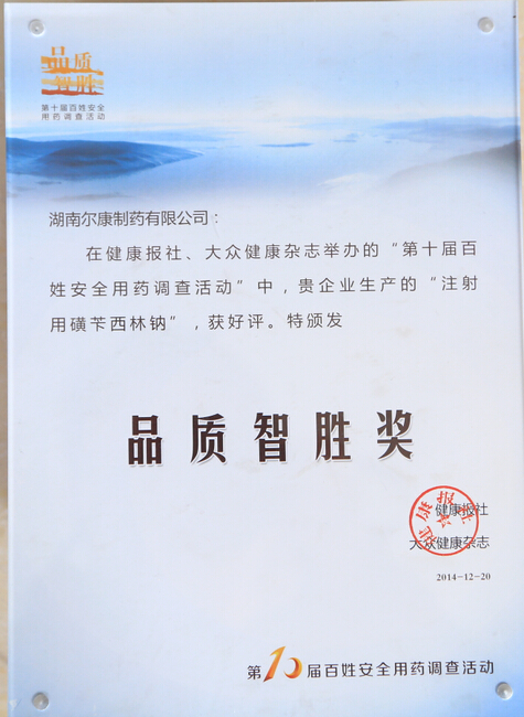 湖南尔康制药荣获“品质智胜奖” 尔康湘药生产的“磺苄西林钠”获得百姓认可 12月20日,由国家卫生计生委药政司指导,健康报社和大众健康杂志主办的第10届百姓安全用药调查活动总结大会在广东省深圳市举行。会上,湖南尔康湘药制药生产的“注射用磺苄西林钠”,与广州白云山制药总厂、深圳华润九新药业等在内的30余个企业产品得到百姓认可,荣获“品质智胜奖”。 据了解,此次评审评以健康报及门户网站刊登调查问卷投票依据,由临床专业人员、公众投票产生,候选企业最后经组委会筛选、质量评估确定。因活动内容贴近群众,接受调查的企业产品过硬,活动推出的“放心药奖”评选一直坚持公正、公开的原则,评选过程严谨,透明,并且定期公示调查结果,从而获得了社会公众、医药行业的好评。 湖南尔康湘药制药生产的“注射用磺苄西林钠”之所以能获得百姓认可,这与尔康制药多年来注重研发、注重生产工艺创新,秉持“专业成就未来、品质铸就辉煌”的经营理念密不可分。在同类产品中,湘药生产“注射用磺苄西林钠”采用的是瓶冻冻干生产工艺,其工艺水平和产品质量堪比日本武田公司;另外,湘药的青霉素类冻干粉针剂车间在2013年率先通过新版GMP认证,在品质保证方面更上台阶、领先于同类产品,亦得到医生和患者的认可。 对于患者来说,在抗生素泛滥使用的医疗环境下,注射用磺苄西林钠作为低代次的青霉素类药品,比头孢菌素类(3代、4代)、碳青霉素类等抗菌药品的安全性更好,不易产生耐药性。