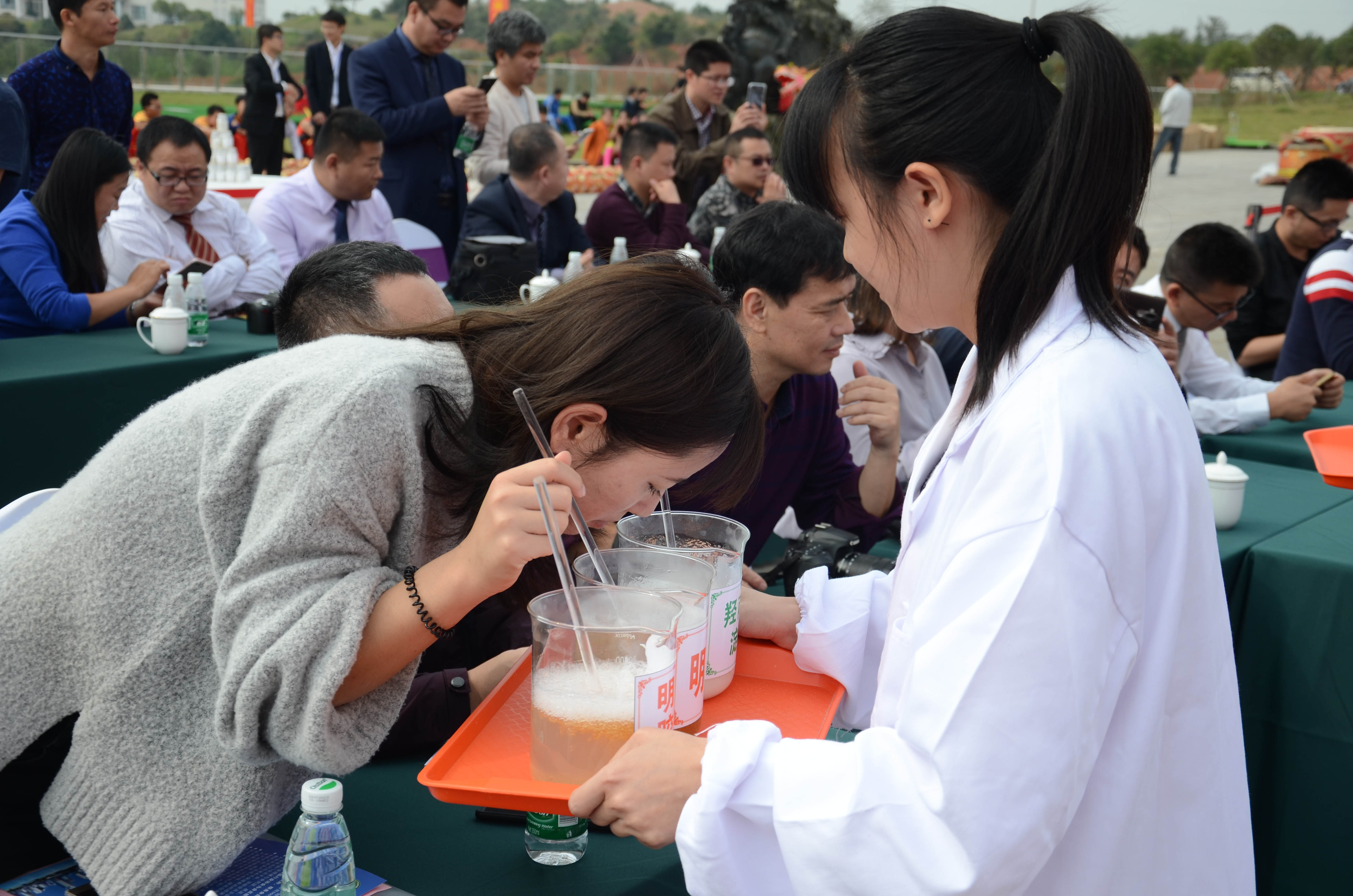 对比试验现场,嘉宾仔细鉴别淀粉胶囊与传统胶囊的不同