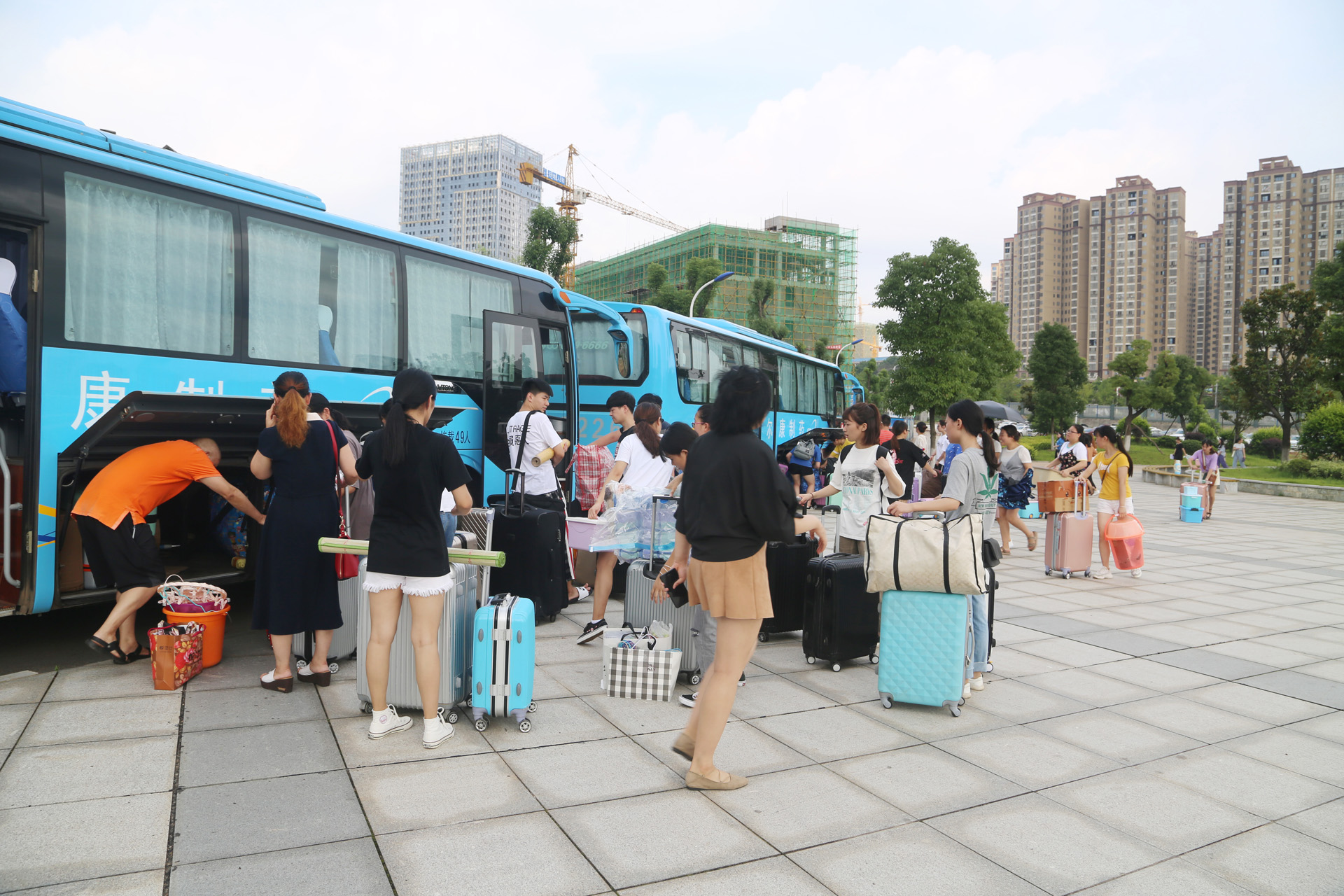 同学们互相帮忙,搬行李、整理行李